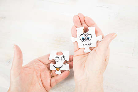 Two puzzle pieces with funny faces holding in hands