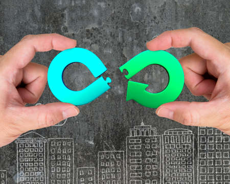 Circular economy concept. Two hands assembling arrow infinity recycling symbol of jigsaw puzzle pieces, on city buildings doodles background.