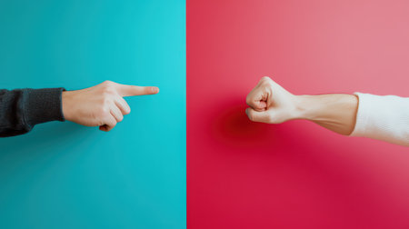 One hand points sharply towards the opposing hand that is clenched into a fist against contrasting vibrant backgrounds.