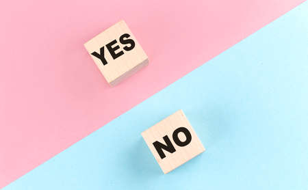 The concept of opposites, wooden block with YES NO on a blue and pink background, flat lay, top view.