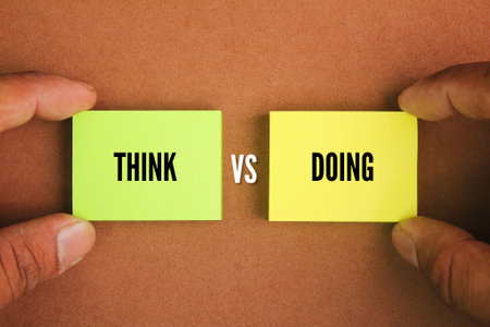 colored paper with the words think vs doing. Sometimes it's better to think less and do more