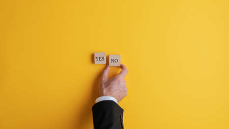 Businessman placing two wooden blocks with Yes and No words on yellow background. With copy space.