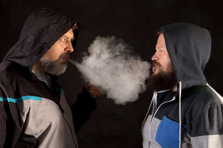 Two bearded man in casual clothes exhaling vapour