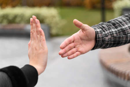man refusing hand shake with his friend to protect herself from coronavirus in public areas. Prevention of fight against pandemic. Non-contact greeting. Quarantine methods to control spread of virus.