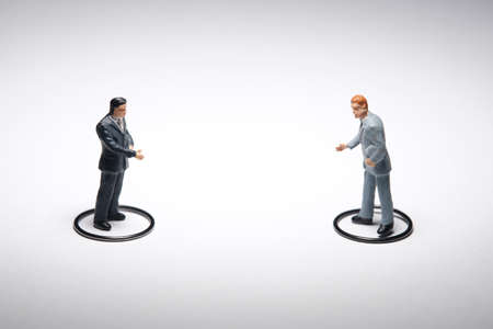 Two businessmen make partnership agreement with maintain physical distance. Miniature people conceptual photography
