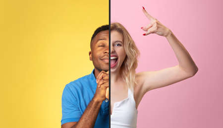 Calm man and rocking woman. Fun and creative combination of portraits of young people with different emotions, various facial expression on splited multicolored background. Copyspace for ad.