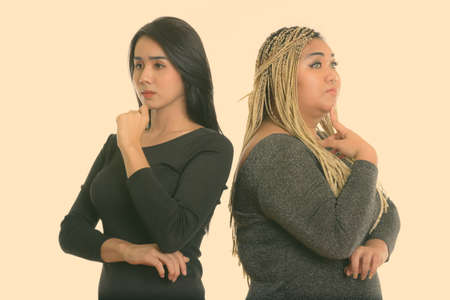 Young Asian transgender woman and fat Asian woman thinking together with back to back