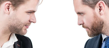 Man face portrait, banner with copy space. business competition. arguing businesspeople. dissatisfied men discuss failure.