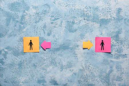 Paper sheets with drawn human figures and arrows on color background. Concept of social distance