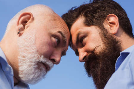 Man looking at each other - close up portrait. Man in different ages. Man vs concept. Old father and son. Senior vs man, confrontation and competition. Angry men looking at each other, close up
