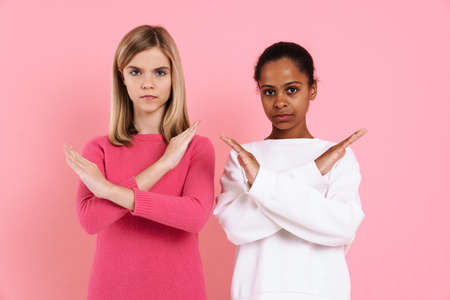 Multiracial girls looking at camera while showing stop gesture isolated over pink wall