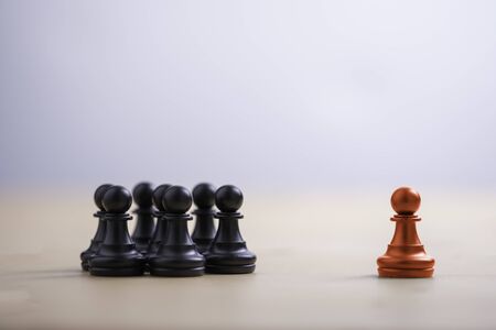 Red pawn chess stepped out of group to show different thinking ideas and leadership. Business technology change and disruption for new normal concept.