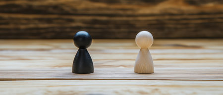 Two simple wooden figurines one black and one white are placed side by side on a textured wooden surface highlighting the contrast between them.