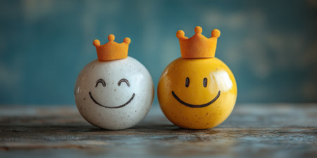 Two smiley face balls, one white and the other yellow with a crown on its head, against a blue background on a simple wooden table. --ar 2:1 --stylize 750 --v 6.1 Job ID: 376c6ef8-c3c8-498e-a463-2635ea625952