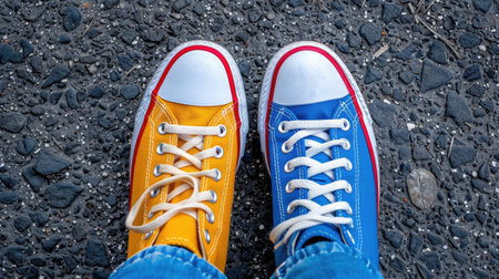 Young fashion couple's legs in jeans and sneakers feet up on wall