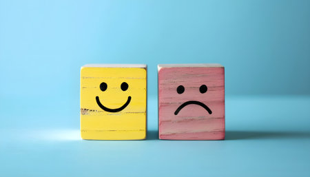 Smile face and sad face on wooden block cubes for positive mindset selection concept