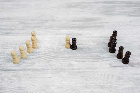 Black pawn surrounded by white ones. Leadership concept. Innovative solutions. Strategies. New ideas. Business. Background.