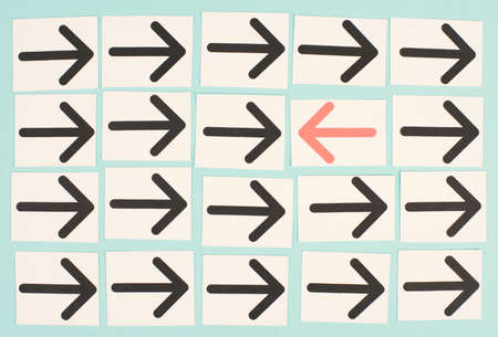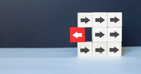 Wooden block with red arrow facing the opposite direction black arrows, Unique, think different, individual and standing out from the crowd concept