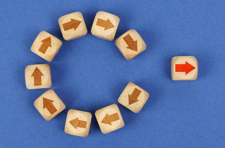 Close up wooden block on blue background with red arrow facing the opposite direction black arrows , Concept of think differently and individual