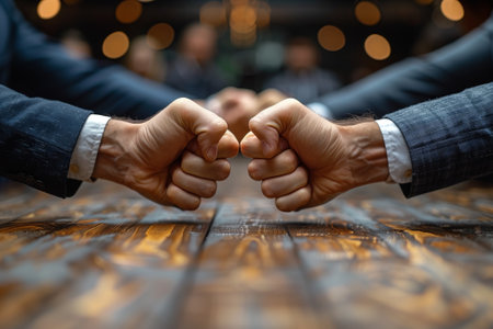 One hand points sharply towards the opposing hand that is clenched into a fist against contrasting vibrant backgrounds.