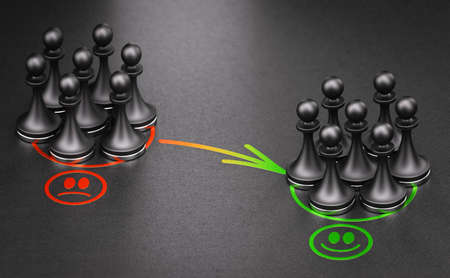 Two circles with unhappy and happy faces with pawns over black background. Concept of Turning Unhappy Customers into Happy Ones. Consumer satisfaction. 3d illustration.