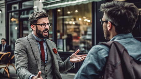 Engaged in Conversation Two Men Gesture and Express, Studio Lighting, Natural Tones.