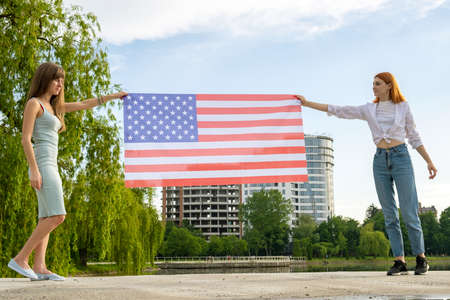 Two young friends women holding USA national flag in their hands at sunset. Patriotic girls celebrating United States independence day. International day of democracy concept.