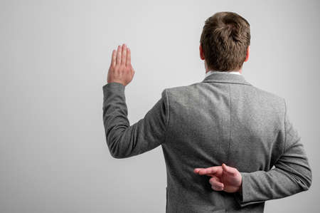 Back view of business man wearing business clothes showing fingers crossed isolated on grey background with copy space advertising area