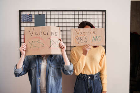 Girls hiding their faces behind the cupboard posters about covid 19 vaccine