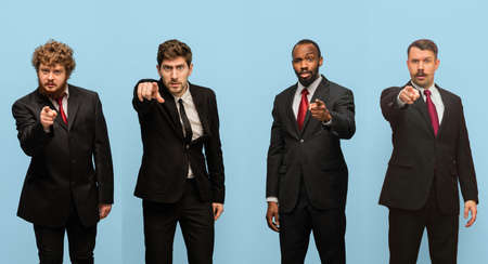 Pointing, choosing. Collage of portraits of four men in dark suits isolated over light blue studio background.