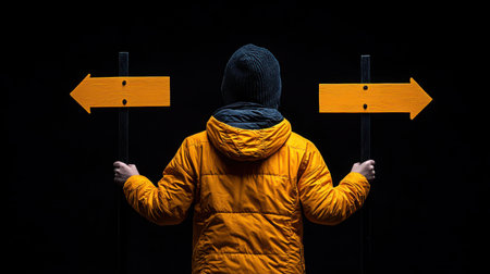 A figure stands at a crossroads, holding yellow directional signs in each hand, representing the theme of choices and decisions in life.