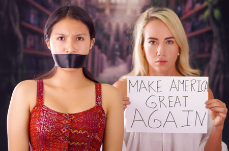 Young mad american blonde woman holding a piece of paper with a description of make america great again, while latin is with a black tape in her mouth, racism, violence or discrimination concept