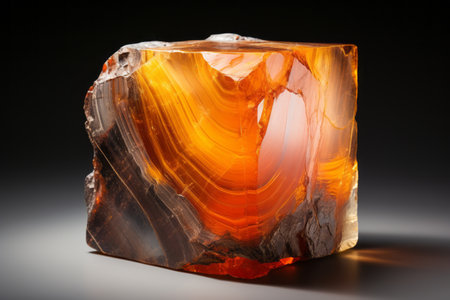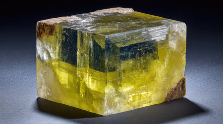 Close-up of an uncut piece of rock or crystal with yellowish-beige crystalline facets. The stone is brightly lit from below or from the side, creating a dramatic effect against a dark, gradient background. Ideal for geology, mysticism, energy, jewelry, and backgrounds.