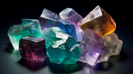 Natural mineral - Polychrome fluorite from Transbaikalia, Russia on black glass background.