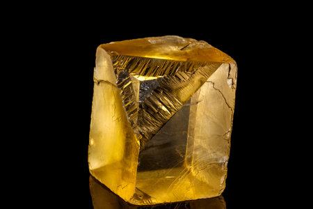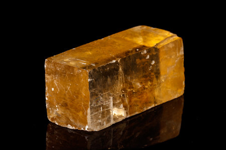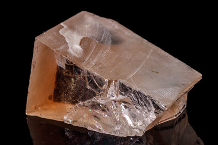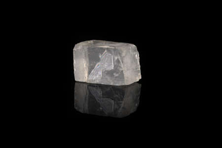 Raw Iceland spar from Krasnoyarsk region, Russia on black glass background.