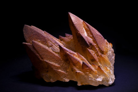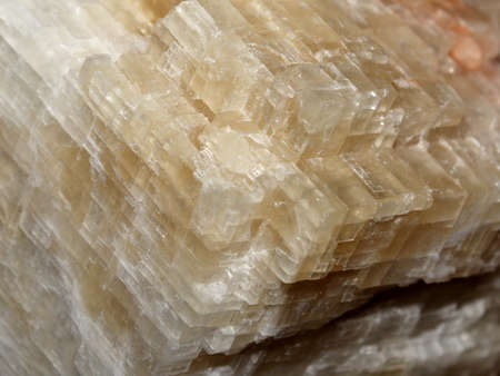 a piece of the mineral calcite, a stone made of calcite rock, a layered structure of a calcite stone from the Caucasus Mountains close-up on a black background, copy spase