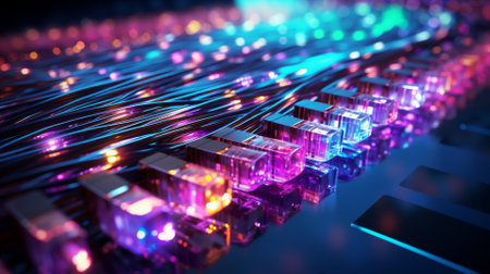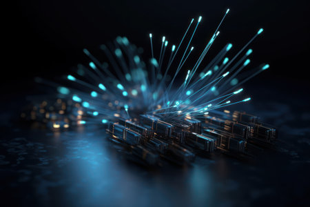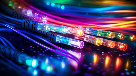 AI Generated. Fiber optic cables with glowing ends in dark background