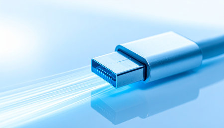 A macro shot of a USB 3.0 connector, glowing with a cool blue light.