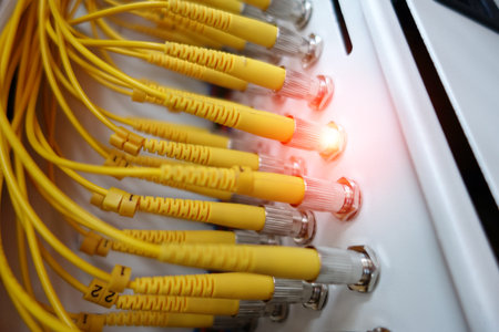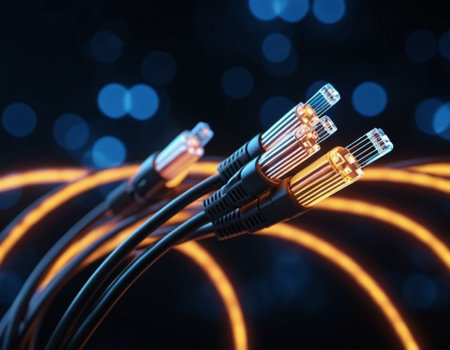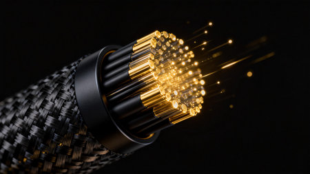optical fiber optic cable closeup with yellow lights on black background