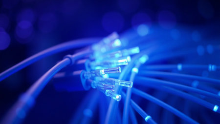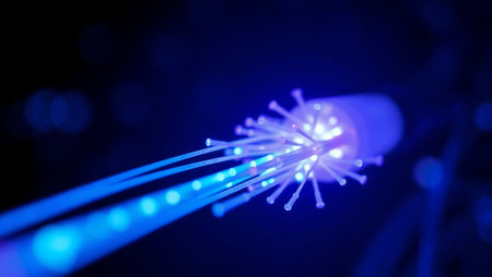 Close-up image of illuminated blue fiber optic cables against a dark, blurred background with bokeh light effects. The glowing fiber ends emphasize the concept of light-based data transmission, representing cutting-edge technology in telecommunications, internet infrastructure, and digital connectivity. Ideal for use in tech-related projects, websites, presentations, and promotional materials focused on innovation, speed, and modern communication systems