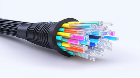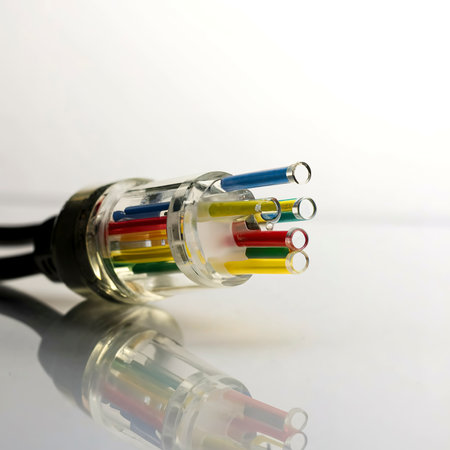 Cross-section of a multicolored fiber optic cable with exposed internal wires