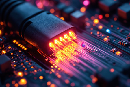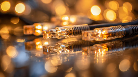 Illuminated connectors of network cables cast vibrant reflections on a sleek surface, framed by soft, golden lights that evoke a modern, immersive digital ambiance.