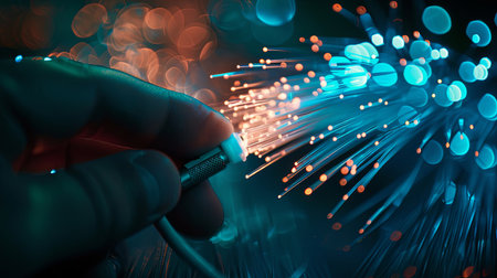 A close-up of a fiber optic cable with glowing signals, representing high-speed network technology.