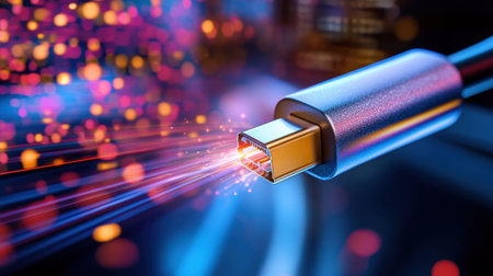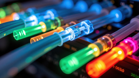 Close-up view of a high-speed fiber optic cable showcasing colorful light transmission. This image represents modern technology in telecommunications, highlighting data connectivity and efficiency in networks.