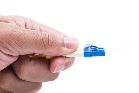 Hand hold plug fiber optic cables single mode LC isolated on white background