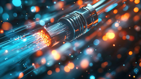 fiber optical network cable close up with bokeh light background