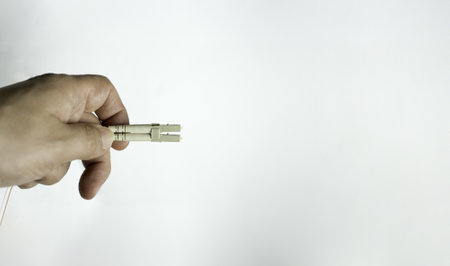 A closeup shot of LC connector of fiber optics cable in hand on white background