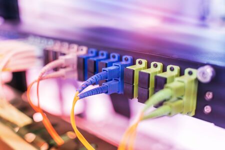Technology network center with fiber optic equipment patch cords closeup