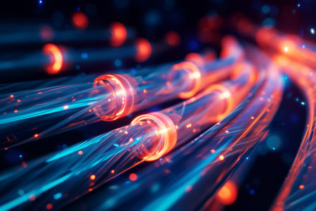Red optical fibers conveying data, symbolizing high-speed internet and connectivity.