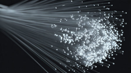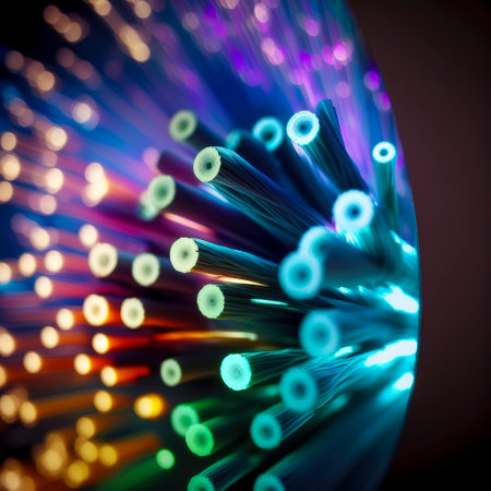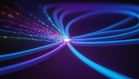 This image depicts an abstract representation of glowing fiber optic cables on a dark background, featuring blue light dots that create a futuristic digital atmosphere.